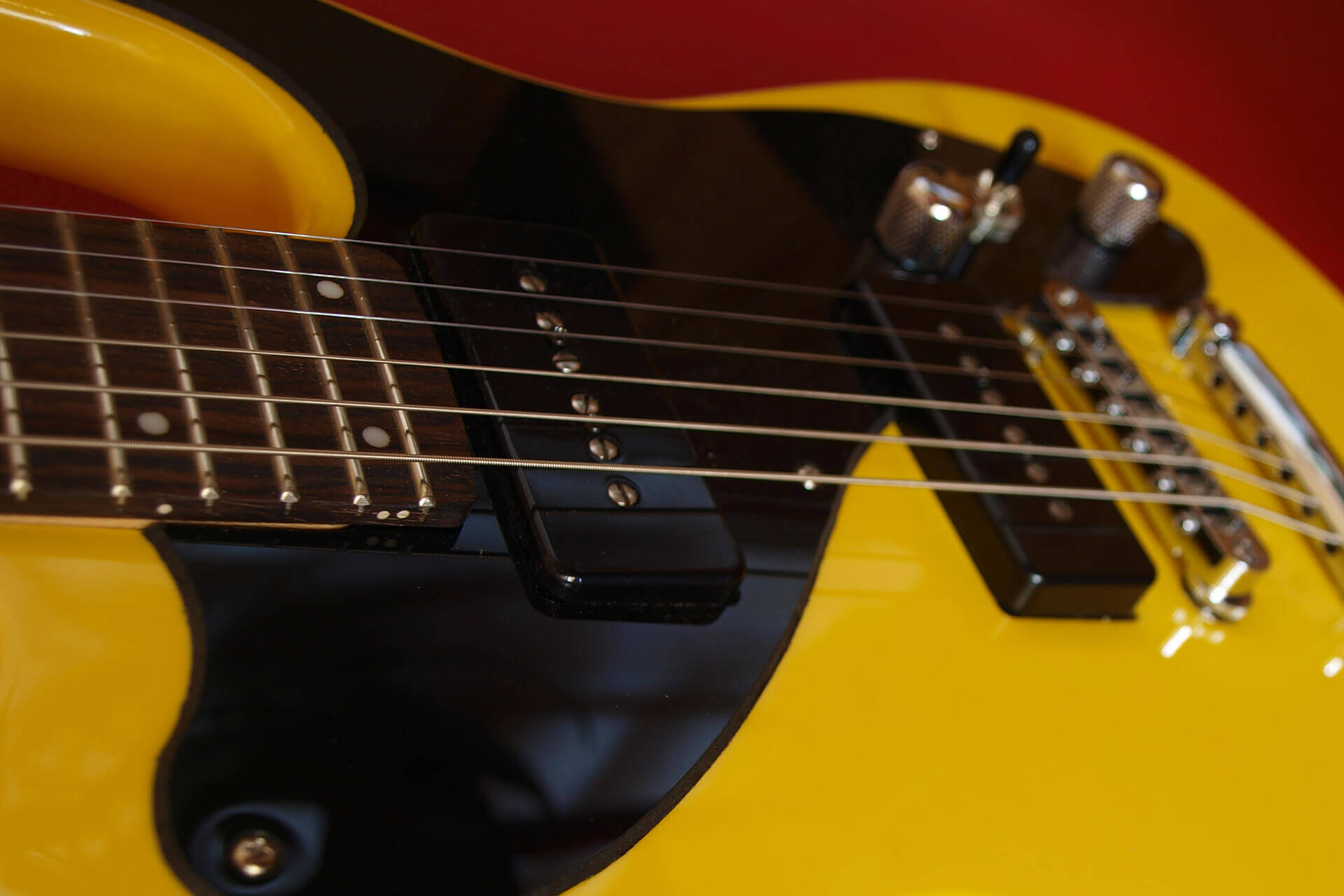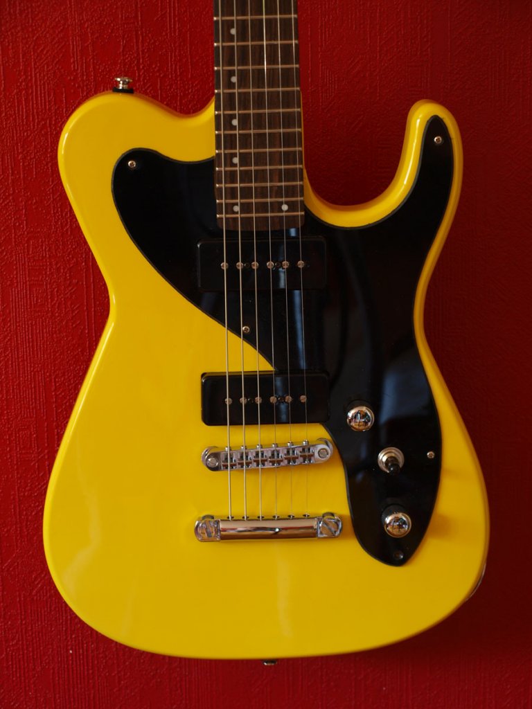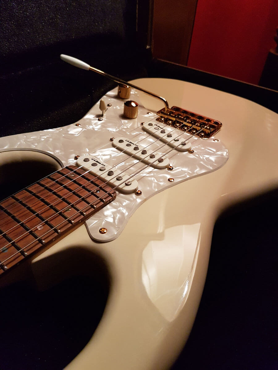 As standard this guitar comes with chrome hardware, solid colors and a plain pickguard. At extra costs there are a lot of options such as gold hardware, sunburst or transparent custom colors etc. Call for prices.