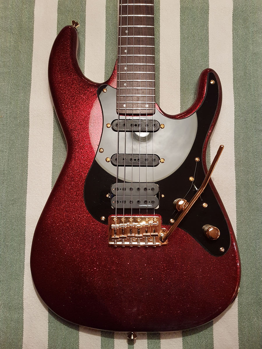 As standard this guitar comes with chrome hardware, solid colors and a plain pickguard. At extra costs there are a lot of options such as gold hardware, sunburst or transparent custom colors etc. Call for prices.